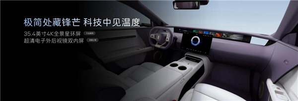 车内搭载四屏联动系统,包括35.4英寸4K全景星环屏、15.6英寸悬浮式中控屏、双6.7英寸高清外后视镜屏,实现信息流转交互。