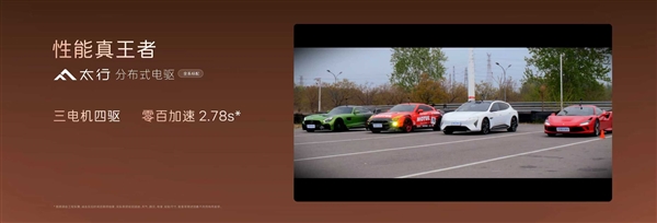 入门版配双后驱电机,零百加速能力3.74秒,而三电机四驱零百加速更能达惊人的2.78秒。