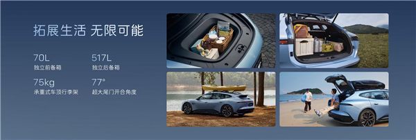 作为一款旅行车,阿维塔06T拥有相比轿车更大的后备厢空间和头部空间,配备车顶行李架承重可达75kg,后备厢容积为517L,支持露营装备装载、骑行收纳、车顶拓展、长物安置等多场景使用。