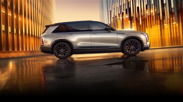 新车尺寸为5222/2026/1799mm,轴距为3094mm,定位大型SUV,采用了凯迪拉克品牌新能源车型的家族化设计,封闭式的黑晶光耀前格栅搭配盾型中网结构,两侧分体式大灯组很有辨识度,包含纵向布局的直列式流光大灯。