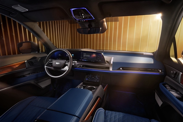 进入车内,一眼就是典型的凯迪拉克豪华风,中控台上配备33英寸曲面连屏,车辆座椅调节以及通风加热等功能按键均集成在门板处,同时还提供23扬声器AKG Studio音响系统。