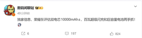 最新的爆料显示,荣耀目前正在积极评估双电芯10000mAh电池方案。如果该方案能够顺利实现量产,荣耀将成为行业内首家实现双电芯万级大电池与百瓦级超快闪充完美组合的手机品牌。
