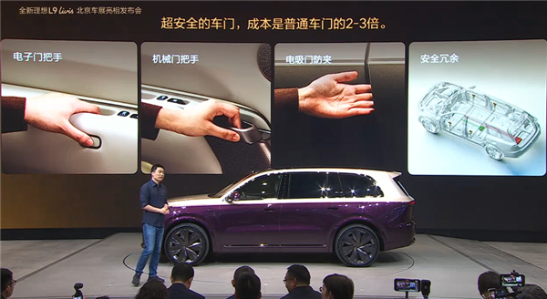 换装了带机械结构的半隐藏式门把手,并拥有双路备份解锁信号、双重电源保障,同时标配防夹电动门,李想本人甚至还亲自用手指头实测了一番,确实对自家产品很有信心。