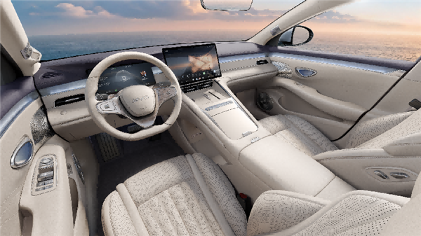 前脸以巨鲸巡海为灵感,搭配行业领先752cm2发光面积的前灯;侧面线条干净利落,搭配百万豪车同款流嵌式门把手、悬浮轮芯盖等细节;尾部采用阔幕一体尾门与业内最长尺寸尾灯。