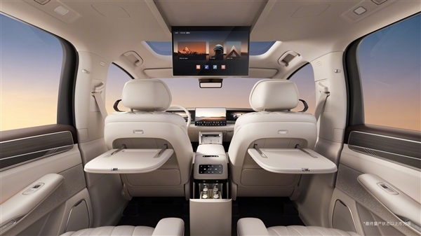 该车启用全新的三屏设计,包括全液晶仪表屏、悬浮式中控屏和副驾娱乐屏,同时提供抬头显示,中控台下方是无线充电面板,并保留快捷物理按键,后面是木质纹理的杯槽遮盖,还配有17.3英寸后排吸顶屏、双小桌板以及小冰箱,并搭载7.1.4声道帝瓦雷27扬声器。