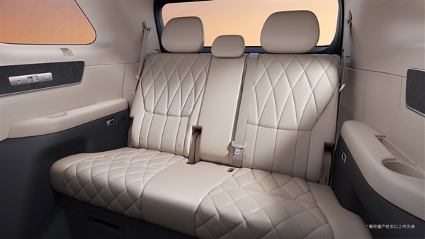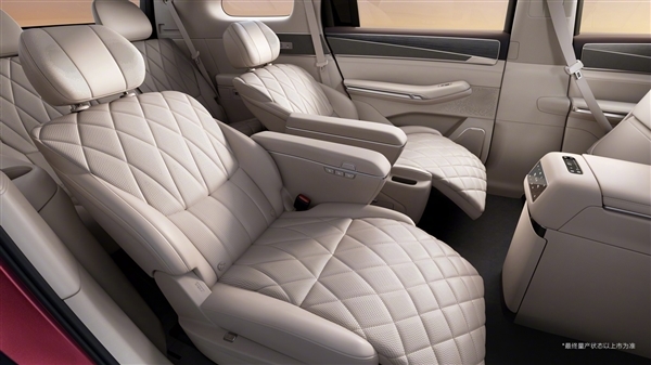 首创2+2+3 MPV式座椅布局,前排配双零重力座椅,二排还提供双零压航空独立座椅,菱形的缝线提升了高级感,拥有一体式腿托,支持一键躺平功能,第三排座椅也可以电动调节,并拥有座椅加热功能。