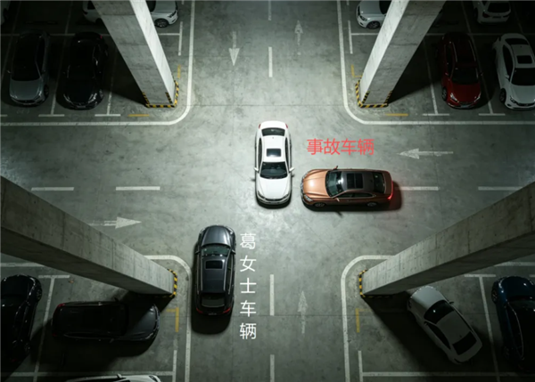事发时葛女士的车未停入正规泊位,事故现场为车库十字岔口,两辆行驶车辆相撞,均未接触葛女士的车辆,起初交警处置时也未将其车辆与事故关联。