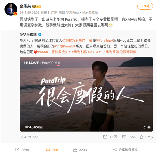 包小可4月29日消息,华为常务董事余承东今天发文力荐华为Pura 90系列为假期出游必备影像旗舰,称带上Pura 90就等于随身携带专业摄影师,依托XMAGE智拍,无需复杂参数调节,随手就能拍出高质量旅拍大片。