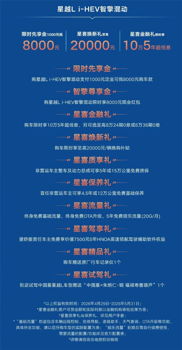 新车外观延续2026款星越L东方曜设计语言,“丝路峰峦”进气格栅搭配熏黑LED大灯组,贯穿式腰线勾勒出修长车身姿态,双边共双出排气造型强化运动属性。