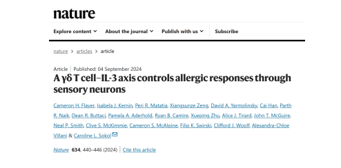 最近,哈佛大学医学院附属麻省总医院的科学家们在《自然》(Nature)期刊上发表了一项重磅研究,首次揭示了一种此前几乎不为人知的免疫细胞——GD3型γδ T细胞,可能是决定我们痒不痒的幕后推手。这些细胞通过分泌一种名为 IL-3 的分子,悄然影响着我们皮肤里的感觉神经元,调控它们对蚊子唾液这类过敏原的敏感度。