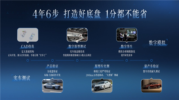 奔驰底盘研发步骤从CAD设计开始,经历数字孪生模拟、数字原型测试、原型车测试、数字孪生,最终完成量产车,两冬两夏、全球500万公里、含中国110万公里的耐久验证。