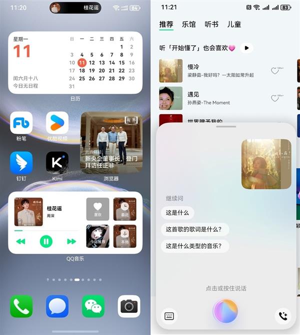 我还很喜欢它的桌面服务卡片功能,特别适合我这种懒人。在手机桌面上直接就能显示“最近听的歌”、“本地音乐”、“收藏歌单”,还有“每日推荐”快捷入口,想听歌时点一下直达播放页,省去了打开App再寻找的步骤。偶尔听到一首不熟悉的歌,还可以长按歌曲封面拖拽给小艺,让它帮我查询关于歌手和专辑的信息,小艺会即刻响应,相关信息立刻就出来了。这种探索音乐的方式既新奇又高效。
