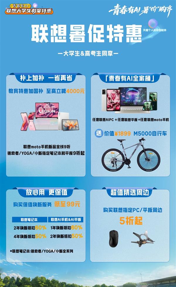 当蝉鸣织就夏日的序曲,丰富多彩的暑期生活,更离不开得力的智能终端相伴。洞察学子们对假期品质与效率的双重追求,联想今夏携天禧AI生态内完整的产品矩阵与丰厚的专属福利重磅而来,专为大学生及应届高考生打造全方位假期支持方案。联想倾力推出“青春有AI”大学生教育特惠计划。 该计划突破传统,创新构建了 “轻松拥有”、 “安心使用” “持续成长”三大核心维度的立体支持体系。