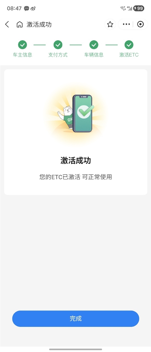 然后用微信或者支付宝扫这个二维码,进入小程序后会自动弹出ETC蓝牙连接提示,跟着小程序指引上传身份证和行驶证,审核通过就能用了。