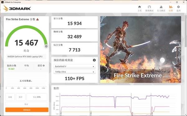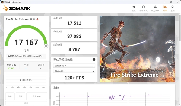 在代表DX11性能的Fire Strike Extreme测试中,移动版RTX5060的显卡成绩为15934,移动版RTX5070的显卡成绩为17513,移动版RTX5070Ti的成绩为22532。