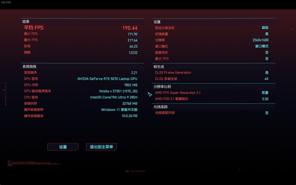 其次是游戏实测,游戏只选择了一款《赛博朋克2077》,这也是一款比较有代表性的游戏了,能够体现出显卡的实际游戏性能。实测画质为预设的超级画质,分辨率为2560 x 1600,并开启4倍多帧生成。