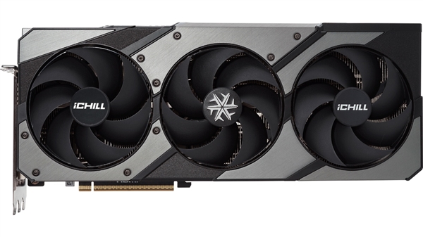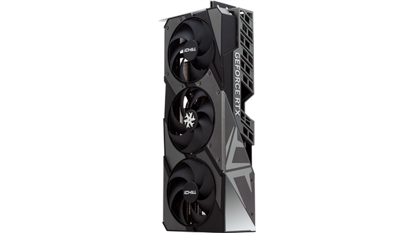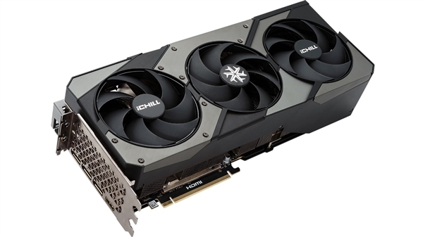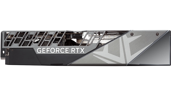 显卡背面实用金属背板,共由核心、iCHLL品牌Logo和散热口构成。通过带有GEFORCE RTX标识的银色盖板,可以看到不规则的四开孔散热通道。在散热口的上方便是隐藏走线盖板。