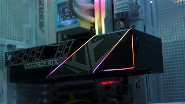 在上机点亮显卡之后,可以从侧面感受到无限深渊ARGB的震撼光场。其核心便在于如上图所示的三角镜面之中。通过折射的原理实现无限向深处延伸RGB效果,明显区别于传统的光效表达。