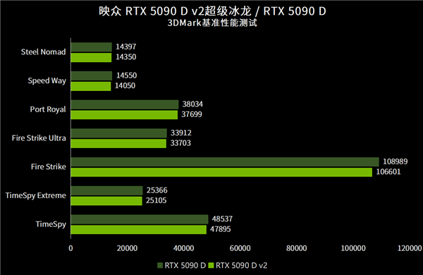 通过3DMark数论测试下来,可以说RTX 5090 D v2和5090 D在性能上的差异极小。这也并非出乎意料,毕竟只有显存配置上有所降低,其他的参数指标无异。
