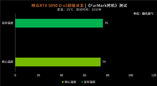 在FurMark烤机软件中,对GPU进行20分钟的满载测试。最终核心温度稳定在74℃,显存温度稳定在76℃。整体的温度表现十分可观,iCHILL X3散热系统可以很好的适应极端环境下的运行。