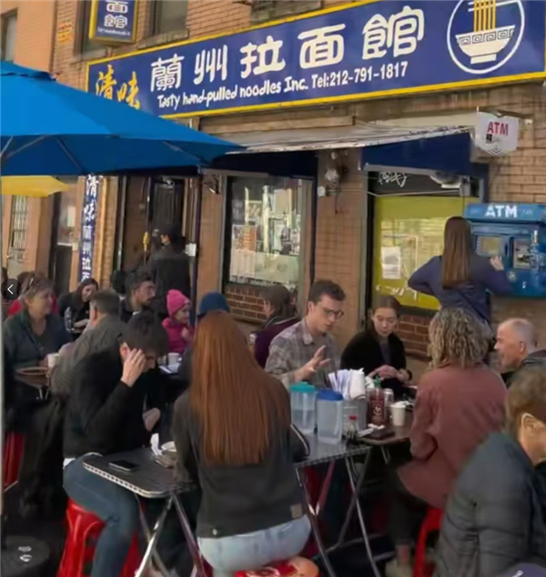 纽约一兰州拉面馆生意火爆:老外排长队 门口坐塑料凳就餐