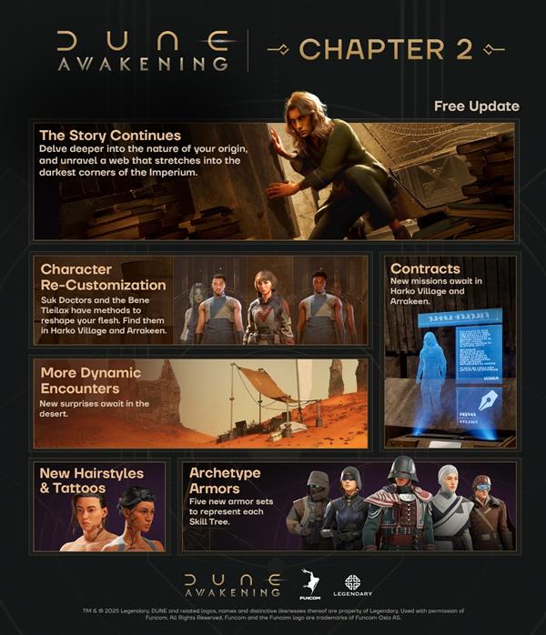 2025年8月20日,开放世界生存制作游戏《沙丘:觉醒》(Dune: Awakening)的开发商 Funcom 在 Into the Infinite 发布会上揭晓了厄拉科斯星球(Arrakis)的未来发展规划。游戏将于9月10日推出第二章,也是首个大型免费内容更新,延续扣人心弦的主线剧情(第一章以悬念收尾),并加入全新世界内容与任务。与此同时,全新独立剧情DLC “The Lost Harvest(失落的收获)”将同步发售,售价12.99美元,将带来独立的全新故事线与多款独特皮肤奖励。
