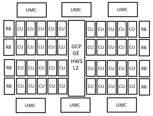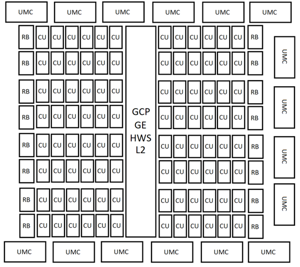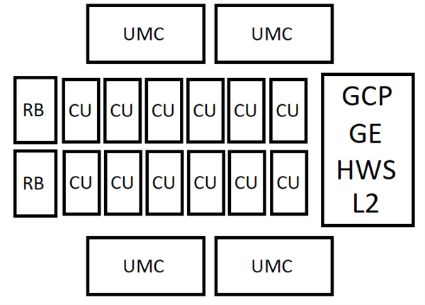 每个着色器引擎都有自己的光栅(RB)单元,这些单元连接到中间的SoC块,该块包含图形命令处理器、图形引擎、硬件调度器(HWS)和L2缓存。