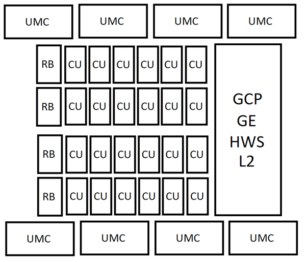 最入门级的芯片仅包含两个着色器引擎,每个包含6个计算单元,总共12个计算单元,该芯片还配备4个内存控制器。