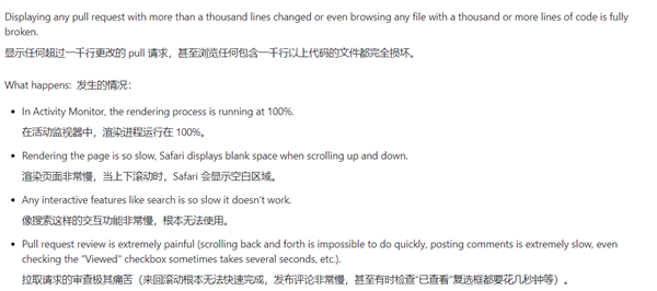 一位用户在GitHub上报告称,当他尝试打开包含超过一千行代码或代码更改的拉取请求(PR)时,浏览器渲染代码需要很长时间。