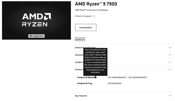 AMD官方解释说,SR2a、SR4散热器已经进入退市阶段(EOL),因此锐龙8000G/7000/5000系列处理器部分型号更新为SR1散热器,取代SR4散热器,2025年8月1日起开始执行。