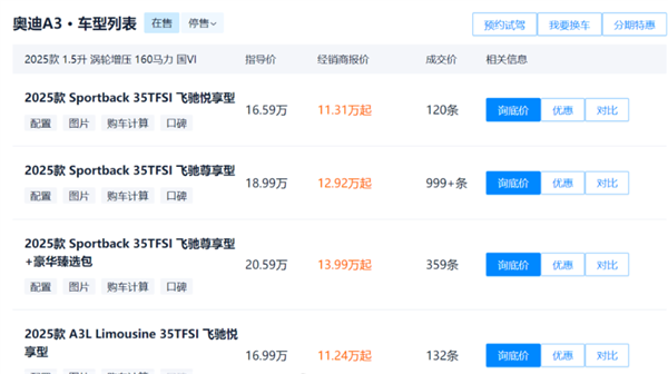 在成都市场,2025款一汽奥迪A3的最低裸车报价已经跌至11.24万元起,相当于打66折。