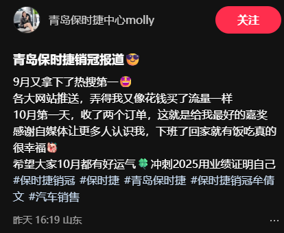 电脑知识网10月2日消息,日前,青岛保时捷销售牟倩文在社交平台发文回应9月再夺销冠。