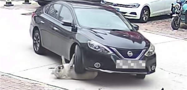 监控视频显示,事发时 “圆圆” 在路中间休息,由于处于视野盲区,一辆黑色的日产轩逸在倒车时一只车轮不慎压到了它身上。