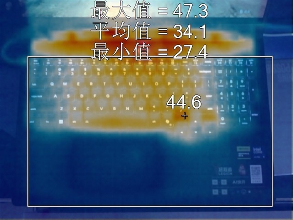 另外我们发现在整个键盘区域,拯救者Y9000P左方向键上方是温度最高点,超能模式下达到了45.1℃。不过WASD键区、腕托区域的温度是非常低的,所以使用机器时的体验相当舒适。