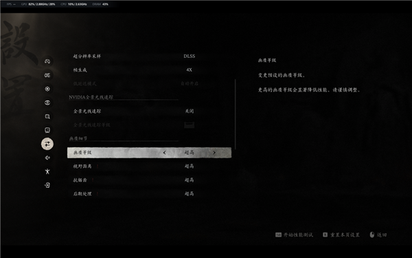测试时,我们将游戏画质设定在超高画质,而非最高的影视级画质,分辨率就设定在默认的2.5K。