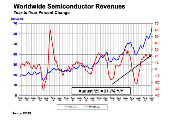 电脑知识网10月8日消息,近日,半导体行业协会(SIA)最新宣布,2025 年 8 月全球半导体销售额达到 649 亿美元,这一数字不仅较 2024 年同期的 533 亿美元实现 21.7% 的同比增幅,较 7 月的 621 亿美元也环比提升 4.4%,延续了行业持续回暖的态势。