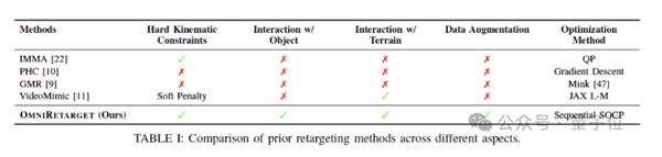 在与其他动作重定向方法的对比中,OmniRetarget在所有关键方面:硬约束、物体交互、地形交互、数据增强表现出了全面的方法优势。