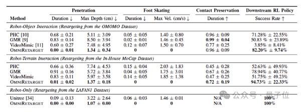 实验结果显示,在运动学质量上,OmniRetarget在穿透、脚部打滑和接触保留指标上整体优于所有基线,即使偶尔轻微穿透也能被 RL 修复。