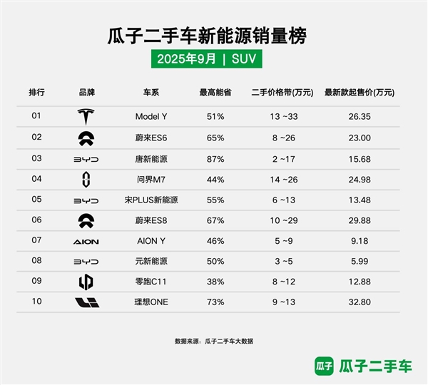 近日,瓜子二手车平台基于真实交易数据,发布了2025年9月新能源二手车销量榜。该榜单揭示了二手新能源市场在轿车、SUV及MPV三大细分领域的销售表现,客观反映了当前二手新能源车的市场热度与消费偏好,为行业观察与消费者选车提供了有价值的参考。