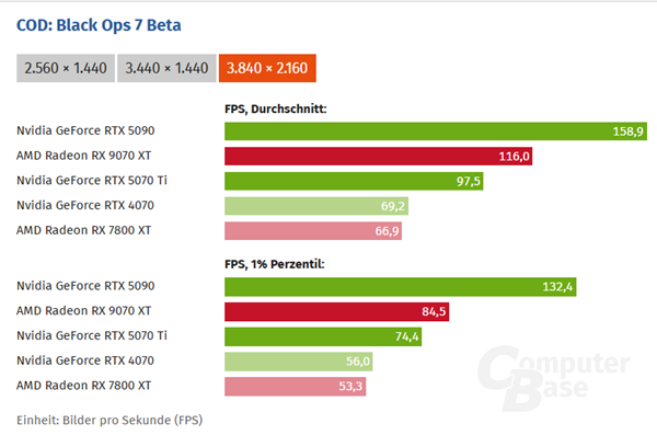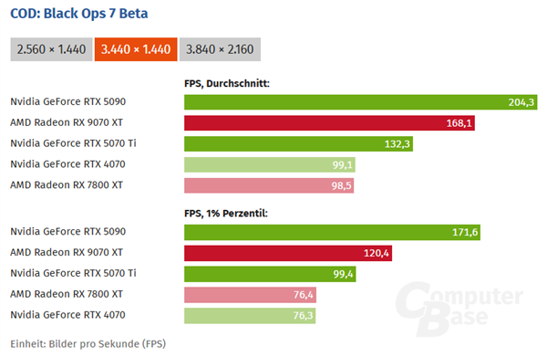 电脑知识网10月9日消息,《使命召唤:黑色行动 7》的抢先体验试玩将在今天结束,根据ComputerBase的测试,AMD RX 9070 XT在1440p分辨率下比RTX 5070 Ti高出了31%。