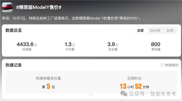 正在休假的网友们也火速吃瓜,“精简版Model Y”相关话题在国内一度冲到热搜TOP5。