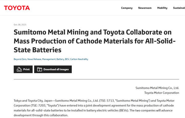 电脑知识网10月9日消息,近日,丰田汽车通过全球官网宣布,已与住友金属矿山株式会社(下称 “住友金属矿山”)达成合作协议——双方将围绕纯电动汽车(BEV)用全固态电池正极材料的量产展开协作,共同加速相关技术的研发进程。