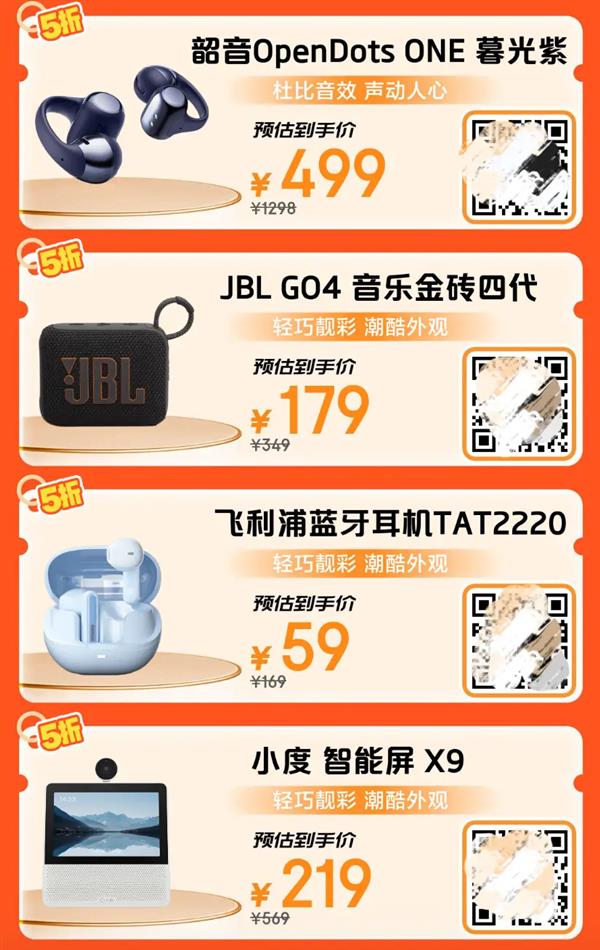 多款高热度耳机音箱设备以“一步到位价”覆盖主流使用场景,提前锁定5折爆款。运动用户可选择韶音OpenDots ONE骨传导耳机,其不入耳的舒适佩戴与杜比全景声适配跑步、骑行等多种场景,原价1298元,预估手价仅499元。入门级TWS方面,飞利浦TAT2220蓝牙耳机以59元的5折价格适配学生与通勤族的日常听音需求,轻巧便携、随连随用。音箱品类中,JBL GO4音乐金砖四代凭借IP67防水与饱满音质成为户外聚会、室内休闲的优选,限时5折价179元即可入手;而小度智能屏X9作为带屏智能音箱,支持语音交互与视频播放,219元即可构建家庭娱乐控制中心。