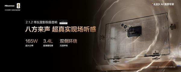 音质方面也没让人失望,海信直接找了法国高端声学品牌帝瓦雷合作,一起搞出了2.1.2声道的影院级侧环绕重低音系统。光说体验不够,咱看硬参数:3.4L超大潜低音炮+165W超大功率音响,比上一代产品低音容积多了10%,低频下潜深了25%,整机音响功率也涨了15%。这可不是单纯堆参数,实际听感真的能“震”到你——看有大场面的内容时,震撼的音效能让胸腔跟着共振;听现场感强的音频时,乐器的细节、人声的层次都清清楚楚,就像真的坐在现场一样,沉浸式听感直接拉满。