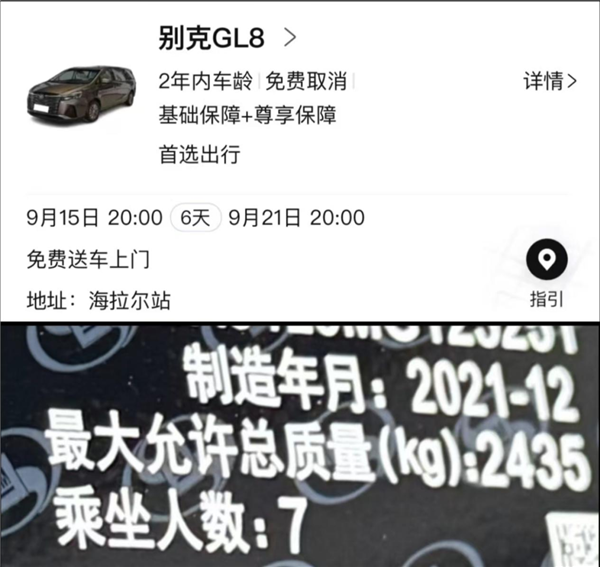 他称,自己在呼伦贝尔租车时,选择了一辆2年内车龄的别克GL8,但在取车时发现车辆明显很旧,他查看车身上的生产日期,结果是2021年的车,与宣传中的2年内车龄完全不符。