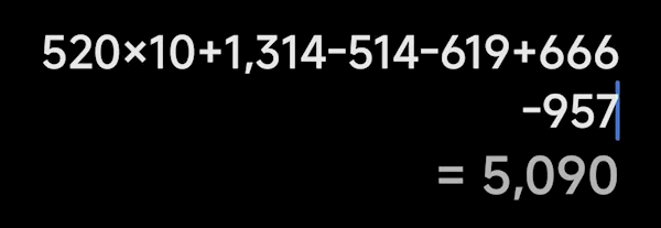 新娘先吊足了丈夫的胃口,接着让他解一道计算题:520×10 + 1314 – 514 – 619 + 666 – 957。
