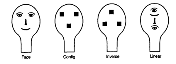 科学家们曾在婴儿出生后数小时,就让他们观看不同的图案。其中一种是“类似人脸”的配置(两点在上,一条横线在下,类似眼睛+嘴),另一种是同样元素但随机排列的图形。