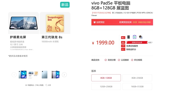 售价方面,vivo Pad5e 8GB+128GB售价1999元,8GB+256GB售价2299元,12GB+256GB售价2599元,16GB+512GB售价2999元。