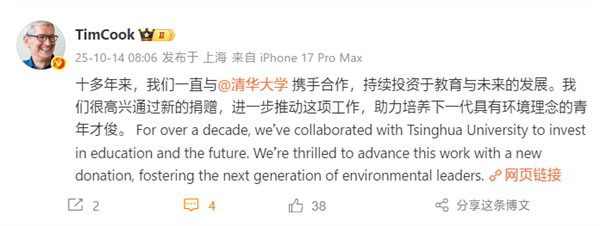 电脑知识网10月14日消息,苹果官网今天发布公告宣布,向清华大学启动一项新的捐赠计划,进一步深化公司对推动中国环境教育发展与培养下一代气候行动领袖的长期承诺。