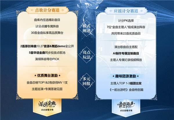 更值得一提的是,激励机制也全面升级:金曲总榜 TOP1&2 可获专属 MV 拍摄机会与主题巡演资源,主理人 TOP1-3 还能参与《一起出游吧》金曲特别篇团游,既满足了粉丝对优质舞台的期待,也为偶像提供了 “舞台演出 + 综艺曝光” 的双重机会,让经典金曲活动焕发全新活力。